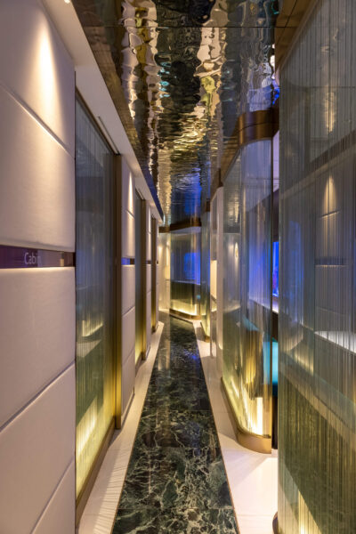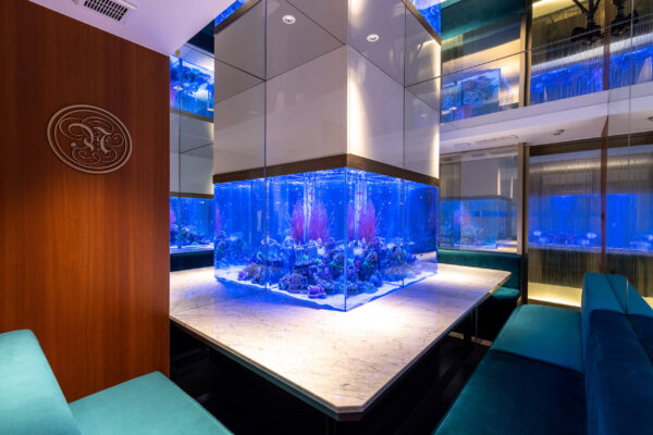 The Grand Blue Express is a luxury aquarium dining restaurant in Tokyo, Japan. The renovation work took place on the 5th floor of a mixed used building with a narrow floor area limited to 95㎡ and a floor to beam not exceeding the 2.3meters high.
